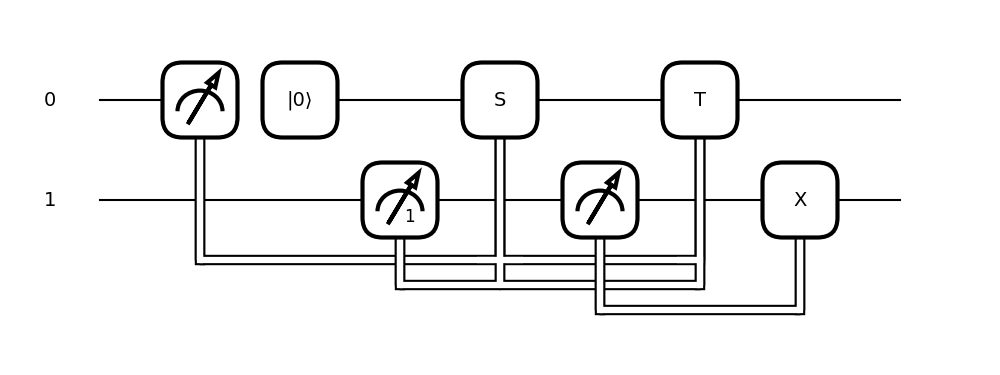 qml.draw()and the graphicalqml.draw_mpl()methods.def circuit(): m0 = qml.measure(0, reset=True) m1 = qml.measure(1, postselect=1) qml.cond(m0 - m1 == 0, qml.S)(0) m2 = qml.measure(1) qml.cond(m0 + m1 == 2, qml.T)(0) qml.cond(m2, qml.PauliX)(1)The text-based drawer outputs: